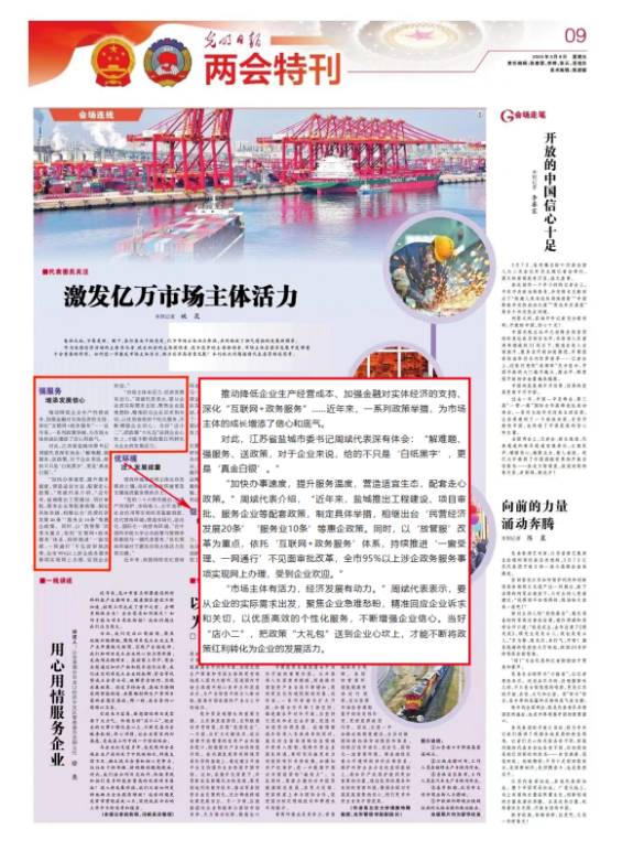 對此,江蘇省鹽城市委書記周斌代表深有體會:“解難題、強服務、送政策,對于企業(yè)來說,給的不只是‘白紙黑字’,更是‘真金白銀’。”