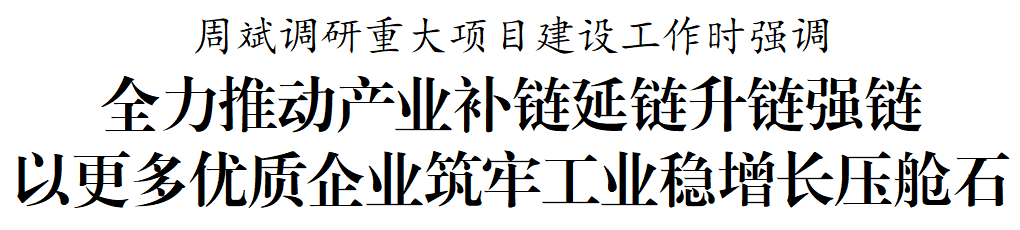 周斌在調(diào)研中強(qiáng)調(diào),重大項(xiàng)目是撐起我市經(jīng)濟(jì)社會(huì)發(fā)展的“硬脊梁”。各地各部門要切實(shí)增強(qiáng)責(zé)任感緊迫感,牢固樹立“項(xiàng)目為王”理念,圍繞“5+2”戰(zhàn)略性新興產(chǎn)業(yè)和23條重點(diǎn)產(chǎn)業(yè)鏈,持續(xù)掀起招商引資和項(xiàng)目推進(jìn)熱潮,夯實(shí)高質(zhì)量發(fā)展的根基。圍繞推進(jìn)新型工業(yè)化與新質(zhì)生產(chǎn)力良性互動(dòng),搶抓大規(guī)模設(shè)備更新等機(jī)遇,推動(dòng)制造業(yè)技術(shù)改造升級,實(shí)現(xiàn)高端化、智能化、綠色化發(fā)展,大力構(gòu)建現(xiàn)代化產(chǎn)業(yè)體系。要做好為企服務(wù),擦亮“鹽誠辦”金字招牌,抓好企業(yè)發(fā)展“三件事”,助力企業(yè)各展所長、深化合作,全面激發(fā)發(fā)展的內(nèi)生動(dòng)力和活力。