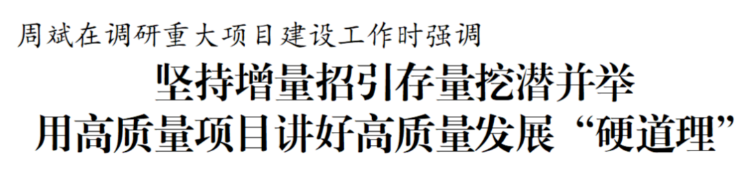 周斌在調(diào)研中強(qiáng)調(diào),重大項目是經(jīng)濟(jì)社會高質(zhì)量發(fā)展的“加速器”和“壓艙石”。今年各項工作已經(jīng)進(jìn)入下半場,各地各部門要增強(qiáng)時不我待的緊迫感,堅持一切圍著項目轉(zhuǎn)、一切盯著項目干,推動重大項目建設(shè)跑出“加速度”,用高質(zhì)量項目講好高質(zhì)量發(fā)展“硬道理”。要堅持增量招引和存量挖潛并舉,既注重招引新項目、好項目,又鼓勵引導(dǎo)現(xiàn)有企業(yè)開展“智改數(shù)轉(zhuǎn)網(wǎng)聯(lián)”、技改擴(kuò)能項目投資。要積極推動制造業(yè)數(shù)字化轉(zhuǎn)型,促進(jìn)專精特新企業(yè)蓬勃發(fā)展,培育壯大智能產(chǎn)業(yè),加快構(gòu)建現(xiàn)代化產(chǎn)業(yè)體系,為推進(jìn)中國式現(xiàn)代化鹽城新實踐提供堅實支撐。