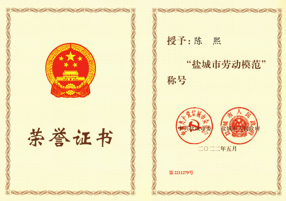 近日,市委市政府發(fā)布關(guān)于表揚(yáng)鹽城市勞動模范的決定,集團(tuán)射陽港區(qū)陳熙同志榮獲“鹽城市勞動模范”稱號。