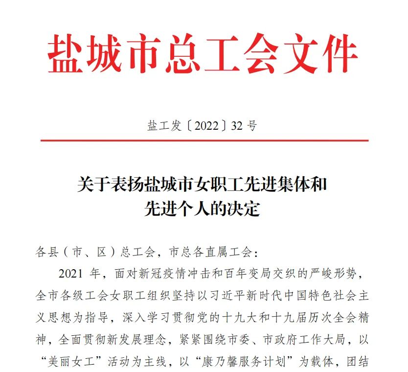 近日,市總工會(huì)發(fā)布《關(guān)于表?yè)P(yáng)鹽城市女職工先進(jìn)集體和先進(jìn)個(gè)人的決定》,袁欣同志、江蘇鹽城港集裝箱物流有限公司業(yè)務(wù)部,分別獲得“鹽城市五一巾幗標(biāo)兵”“鹽城市五一巾幗標(biāo)兵崗”榮譽(yù)稱號(hào)。