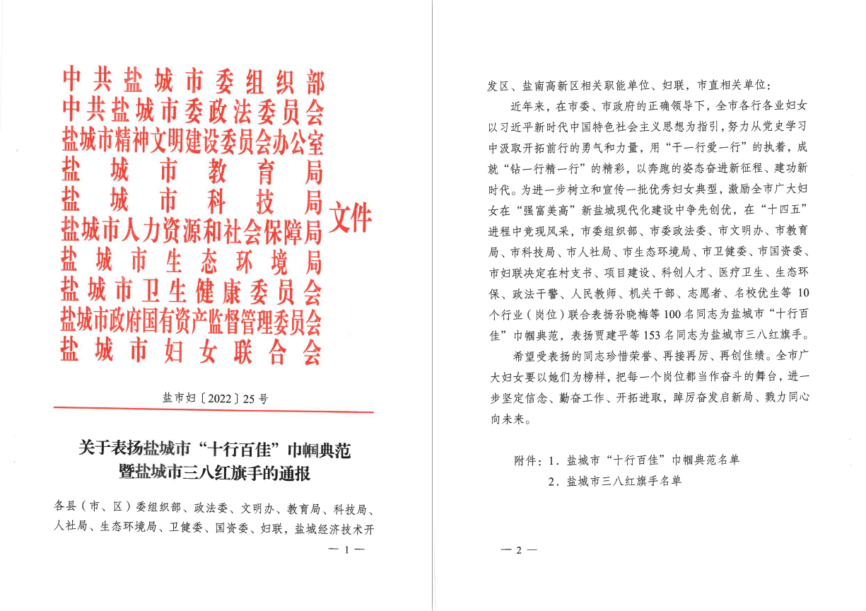 近日,鹽城市婦女聯(lián)合會發(fā)布《關(guān)于表揚鹽城“十行百佳”巾幗典范暨鹽城市三八紅旗手的通報》,袁欣同志榮獲“鹽城市十佳巾幗項目功臣”“鹽城市三八紅旗手”榮譽稱號。