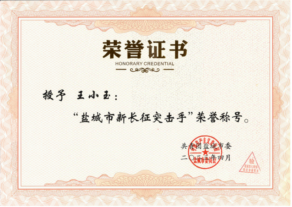近日,共青團(tuán)鹽城市委發(fā)布關(guān)于表彰“鹽城市兩紅兩優(yōu)”及“鹽城市新長(zhǎng)征突擊手”的決定,集團(tuán)王葉娜、陳詩(shī)語(yǔ)、王小玉三名同志分別榮獲“鹽城市優(yōu)秀共青團(tuán)干部”“鹽城市優(yōu)秀共青團(tuán)員”“鹽城市新長(zhǎng)征突擊手”榮譽(yù)稱號(hào)。